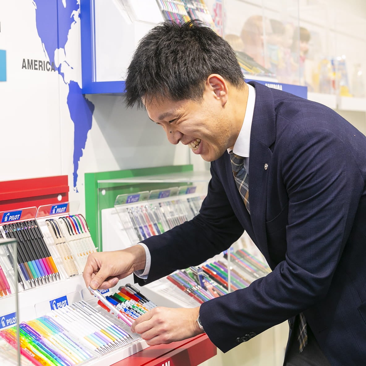 - パイロットインキが製造した文房具は、文具店をはじめホームセンターや大手雑貨チェーン店などで流通しています。当部には世間一般で言う営業職はいませんが、顧客への提案を行う販売促進営業職という職種があり、私もその一人です。